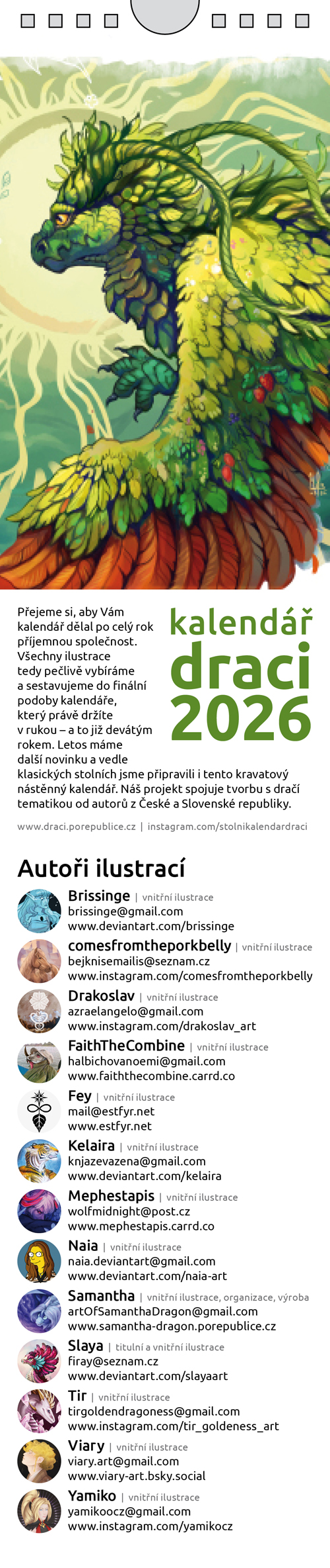 S radostí ovšem musím zdůraznit, že projekt je v tuto chvíli už zcela samostatný a otevřený všem českým a slovenským ilustrátorům! Víte o někom, kdo by se mohl mít zájem zúčastnit a nějaké ilustrace přihlásit? Nebo sami tvoříte a sbíráte odvahu se přihlásit? Můžete se se mnou spojit přímo a to buď přes mail draci@poRepublice.cz na telegramu @SamanthaDragon nebo přes instagram. Nemusíte se bát, že by někdo nějak nevhodně komentoval přihlášené ilustrace, v hlasování žádná taková možnost není :) Nejhorší, co se může stát, je že obrázek nenasbírá dostatek hlasů a do kalendáře se neumístí. A máte-li chuť si popovídat s ostatními autory a s fanoušky kalendáře, můžete se připojit do skupiny na telegramu.